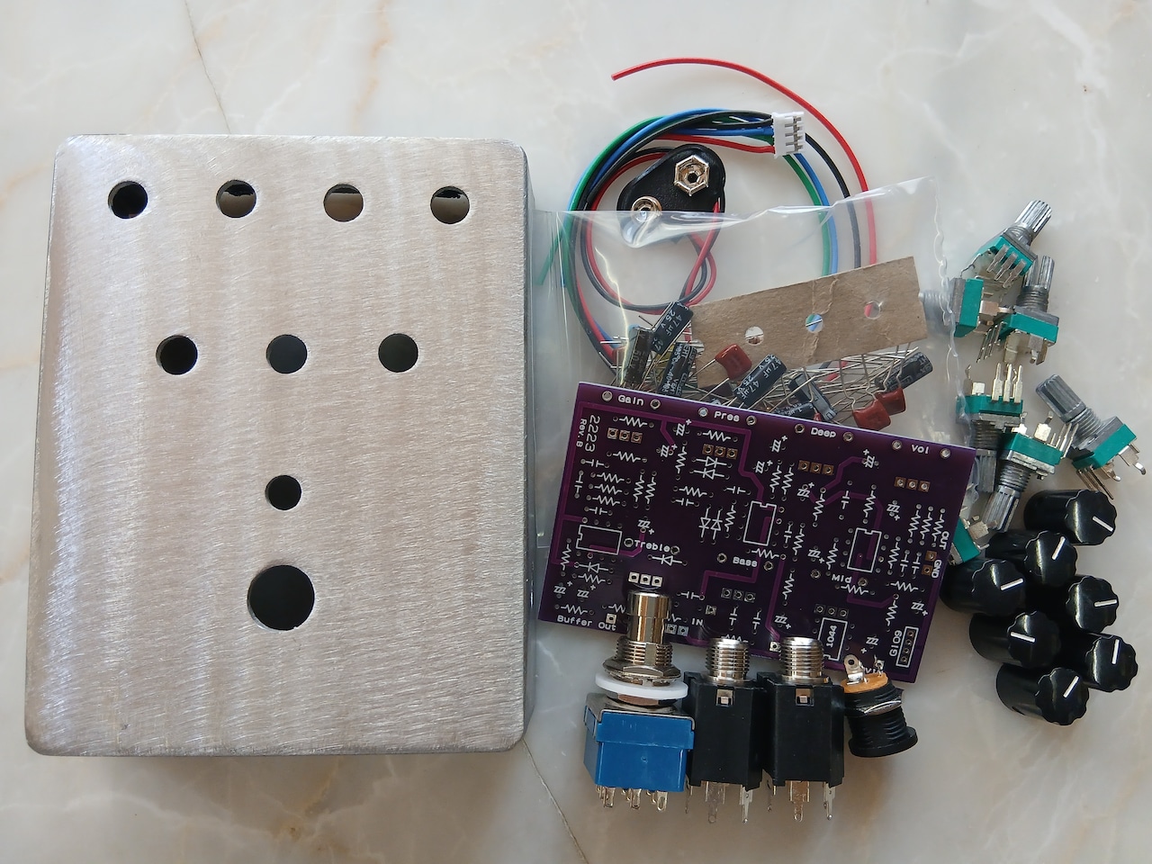 製作に必要なパーツ一式(電子部品、基板、配線材、加工済みケース)のセットとなります。組立てマニュアルとパーツリストが付属します。